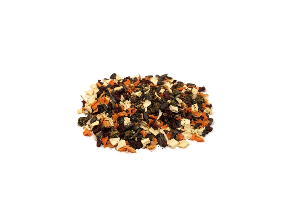 Zloženie: slnečnica čierna, mrkva, paštrnák, červená repa, konopný šrot.